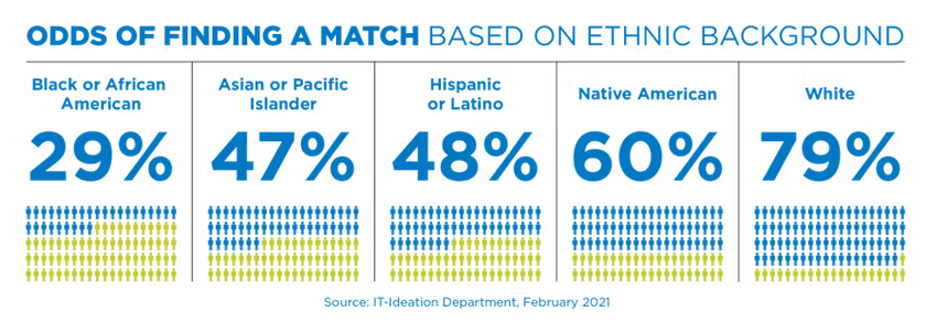 Currently not all patients have an equal chance of finding a match. Patients are more likely to match with a donor of their own ethnic background. By adding more people ages 18-35 to the registry, we increase the odds of every patient finding their life-saving blood stem cell donor.